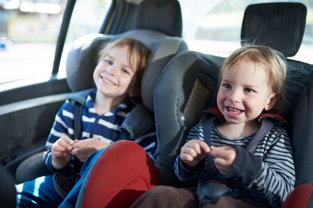 Portrait of pretty boys sitting in car seats. Child transportation safety.