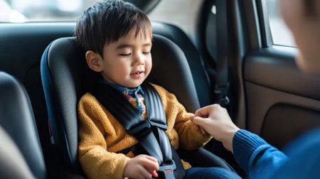A person fastening a child's seatbelt in the backseat of a car, ensuring safe travel