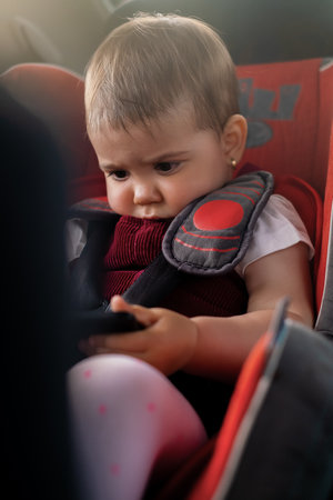 A happy toddler strapped into a child seat, gazing out the window with curiosity and joy, safely secured for the trip.