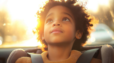 A young child with curly hair sits in a car seat, looking out with curious blue eyes. The sunlight filters through the window, creating a warm atmosphere.