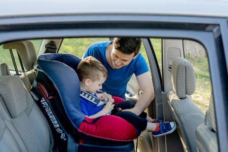 Father putting baby in safety car seat dad and child together family road trip vacations lifestyle infant kid transportation rear-facing.
