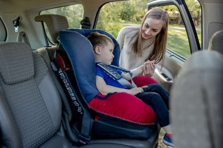 Mother gives the phone little boy sitting in a car seat. Safety of transportation of children