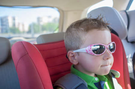 Handsome child boy wearing sunglasses inside the car. Protection of eyes during car trips concept