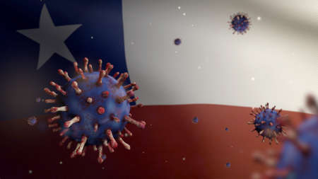 3D illustration Chilean flag waving and Coronavirus 2019 nCov concept. Asian outbreak in Chile, coronaviruses influenza as dangerous flu strain cases as a pandemic. Microscope virus Covid19 close up.
