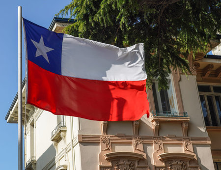Detailed close up of the national flag of Chile waving in the wind on a clear day. Democracy and politics. South american country. Selective focus.