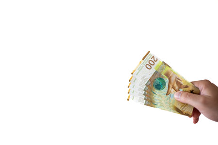 A stack of 200 Swiss francs cash banknotes or bills held by Caucasian male hand. Close up studio shot, white background.