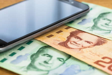 Costa Rica money, banknotes lying on the table together with the mobile phone, High denominations