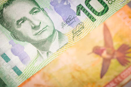 Money from Costa Rica, Colones, Various banknotes spread out on the table