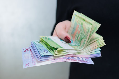Hands holding Brazilian real notes, Brazil BRL banknote, Brazilian currency, economy and business.