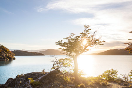 a wide angle view of lake pehoe and the paine massif from a lookout on a autumn sunrise at torres del paine national park in patagonia, chile