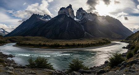 Amazing landscape at Torres del Paine, National park in Chile. Beautiful mountains and river
