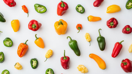 A top view of various types of peppers scattered on a white background. Colorful assortment of various types of fresh peppers arranged on white background, culinary and food blogs. Red, green, yellow peppers, vibrant fresh vegetables, healthy diet, organic produce, farm fresh harvest, culinary ingredients
