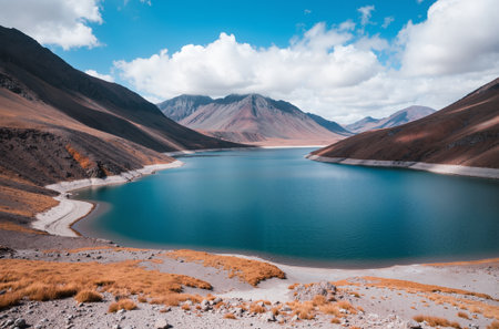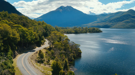 A mesmerizing mountain landscape featuring a tranquil lake alongside a winding road, perfect for outdoor adventures and exploration. Ideal for travel themes.