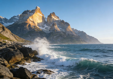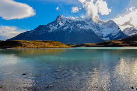 Amazing landscape at Torres del Paine, National park in Chile. Beautiful mountains and river