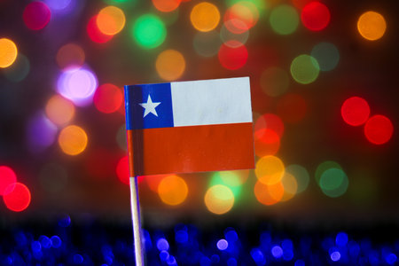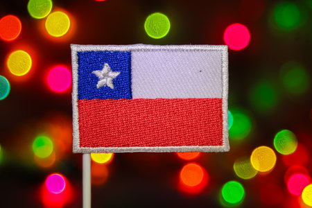 Embroidered Chile flag patch on colorful rainbow bokeh lights background, symbolizing festive holiday spirit.