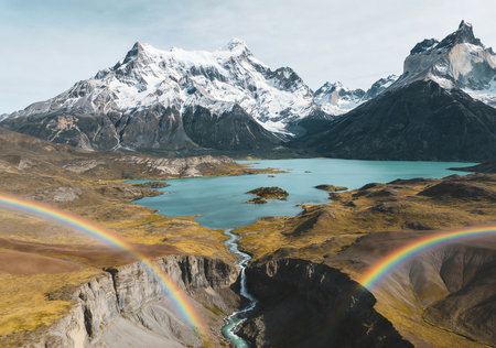 Rainbow over the lake and mountains in Cordillera Blanca, Peru