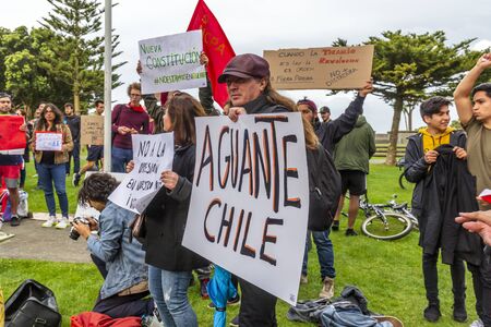 Wellington, New Zealand - October 22, 2019: People demonstrating against the violence and oppression from the government of Sebastian Piñera at Frank Kitts Park in Wellington, New Zealand.