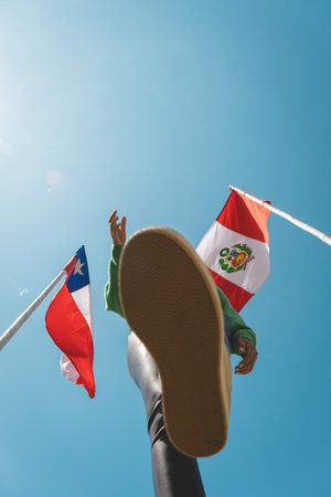 A woman walking at the border, the flags of Peru and Chile. Migration concept