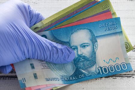 Chile money, Various banknotes kept in rubber gloves. The concept of economy and financial threats during the Coronavirus pandemic