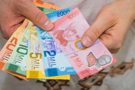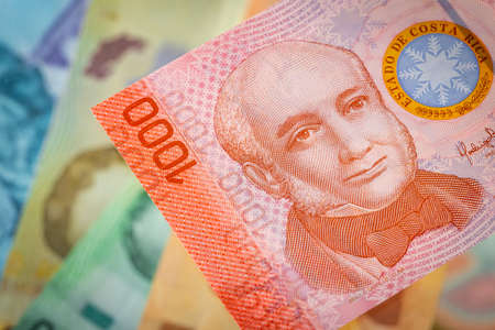 Costa Rica money, Paper banknote with the lowest denomination of a thousand Colones, In the background slightly fuzzy cash with higher values