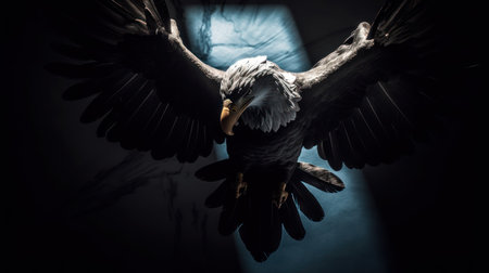 beautiful bald eagle flying in the dark with rays of light.