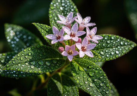 Tiny pale pink star shaped flowers blooming amidst lush green foliage heavily covered in sparkling water droplets, captured in a detailed ultra macro shot against a dark background.