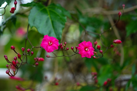 A vibrant close-up of a blooming pink morning glory flower with fresh green leaves and unopened buds, captured in natural light, creating a lush tropical feel.