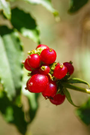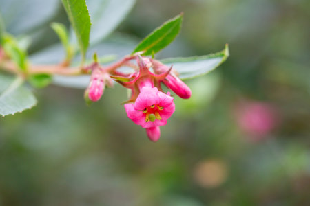 The vibrant green and red colours of Escallonia Rubra. Close-up.