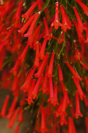 Red blossoms of a firecracker plant. (Russelia equisetiformis)