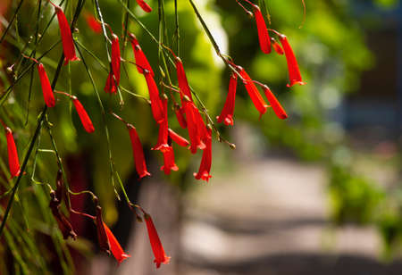 Red firecracker flowers (Russelia equisetiformis) in the garden