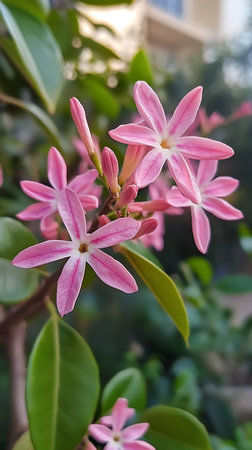 Captures the delicate beauty of pink Rangoon creeper flowers in full bloom. The cluster is enhanced by surrounding green leaves, highlighting fine textures and natural tones.