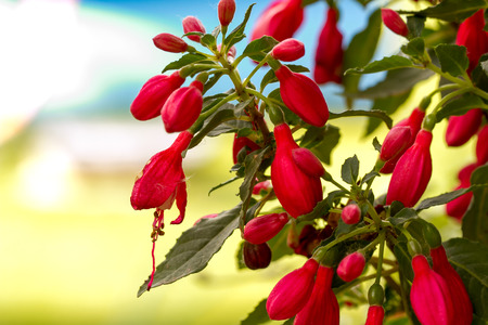 Red flowers background. Dark photo of firecracker. Summer nature wallpaper