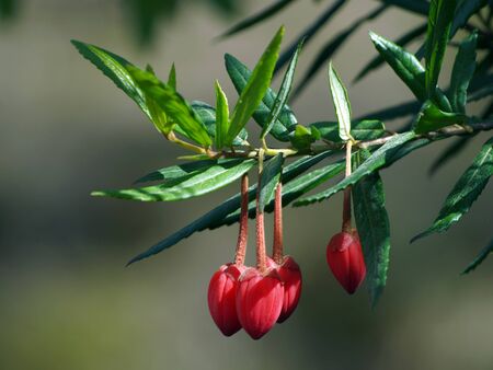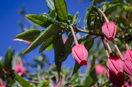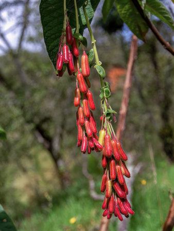 Close-up photography of the hanging fruits of the exotic fuchsia boliviana plant, captured in a forest near the town of Arcabuco in central Colombia.