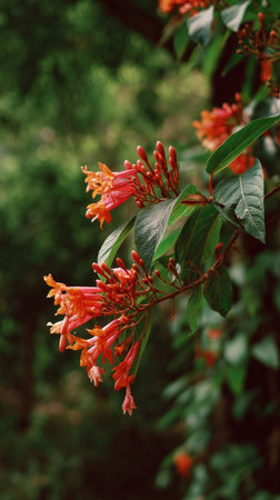 Flamevine orange flowers wall. Green leaves and bright blossoms background