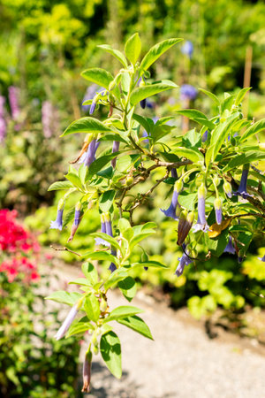 Plants in a park in Barcelona. Iochroma cyaneum, a flowering bush originally from Ecuador