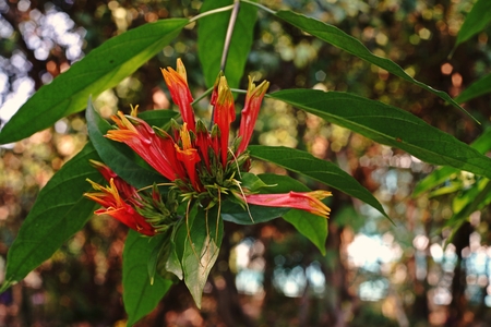 Orange trumpet, Flame flower, Fire-cracker vine flowers with bokeh background (selected focus)