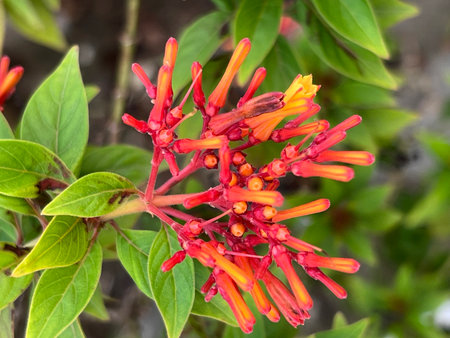 Vibrant exotic tropical bloom of Cuphea Hummingbird's Lunch Cigar Plant, red and yellow tubular flowers with green foliage in the summer garden.