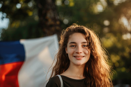 A young woman with long, curly hair smiles warmly, a Chilean flag visible behind her.