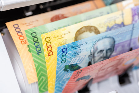 Chile money, A stack of pesos banknotes being fed, Financial and economic concept, close up
