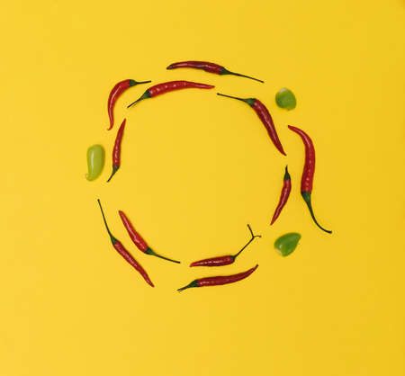 A circular border that creates frame of green paprika and red chilli with copy space in the middle. From above with yellow background.