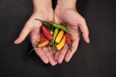 Variety of chili peppers. Red, green and yellow chili pepper on dark background top view