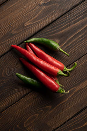 Red hot chili peppers on old wooden background. Top view. Selective focus.