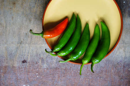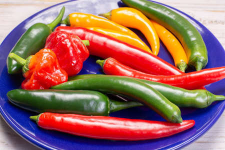 Mexican hot chili peppers colorful mix habanero poblano serrano jalapeno. Vegetarian food. Close-up, top view