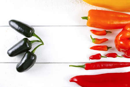 Mexican hot chili peppers colorful mix paprika poblano serrano jalapeno on white wooden board