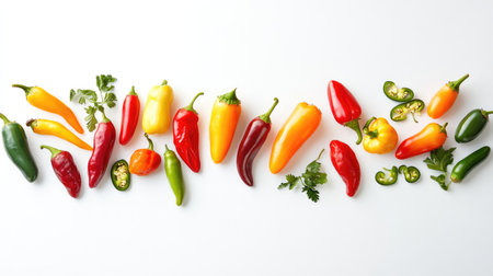 A colorful display of assorted chilies, including bird's eye chilies and jalape arranged artistically on a white background for a fresh and vibrant look.