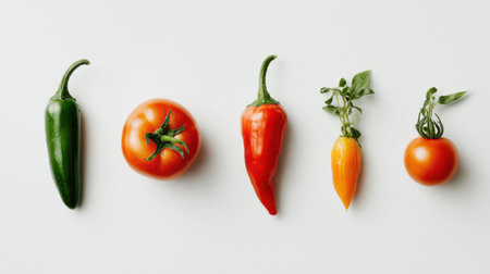 This photograph showcases a colorful selection of fresh vegetables, including different types of tomatoes and peppers, arranged aesthetically on a white background, ideal for culinary projects.