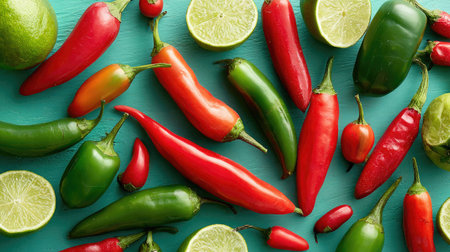 Variety of chillies in red and green arranged in a vibrant scattered layout