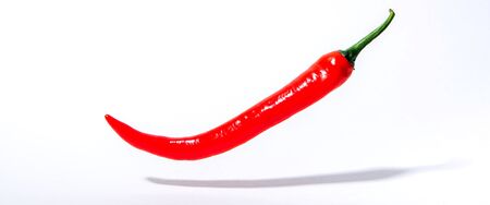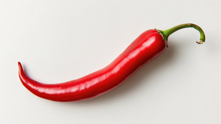 A striking fresh red chili pepper placed on a clean white background, ideal for capturing the essence of vibrant cooking and healthy cuisine.