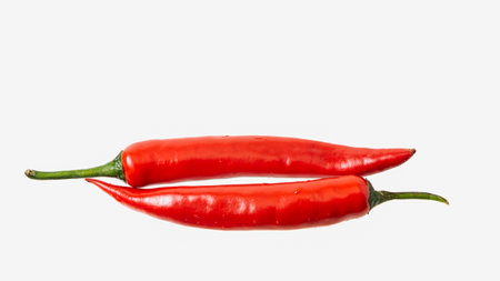 Two hot red chili peppers on a white isolated background.