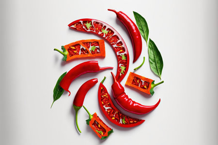 Sliced red hot chili peppers on a white background. a top view